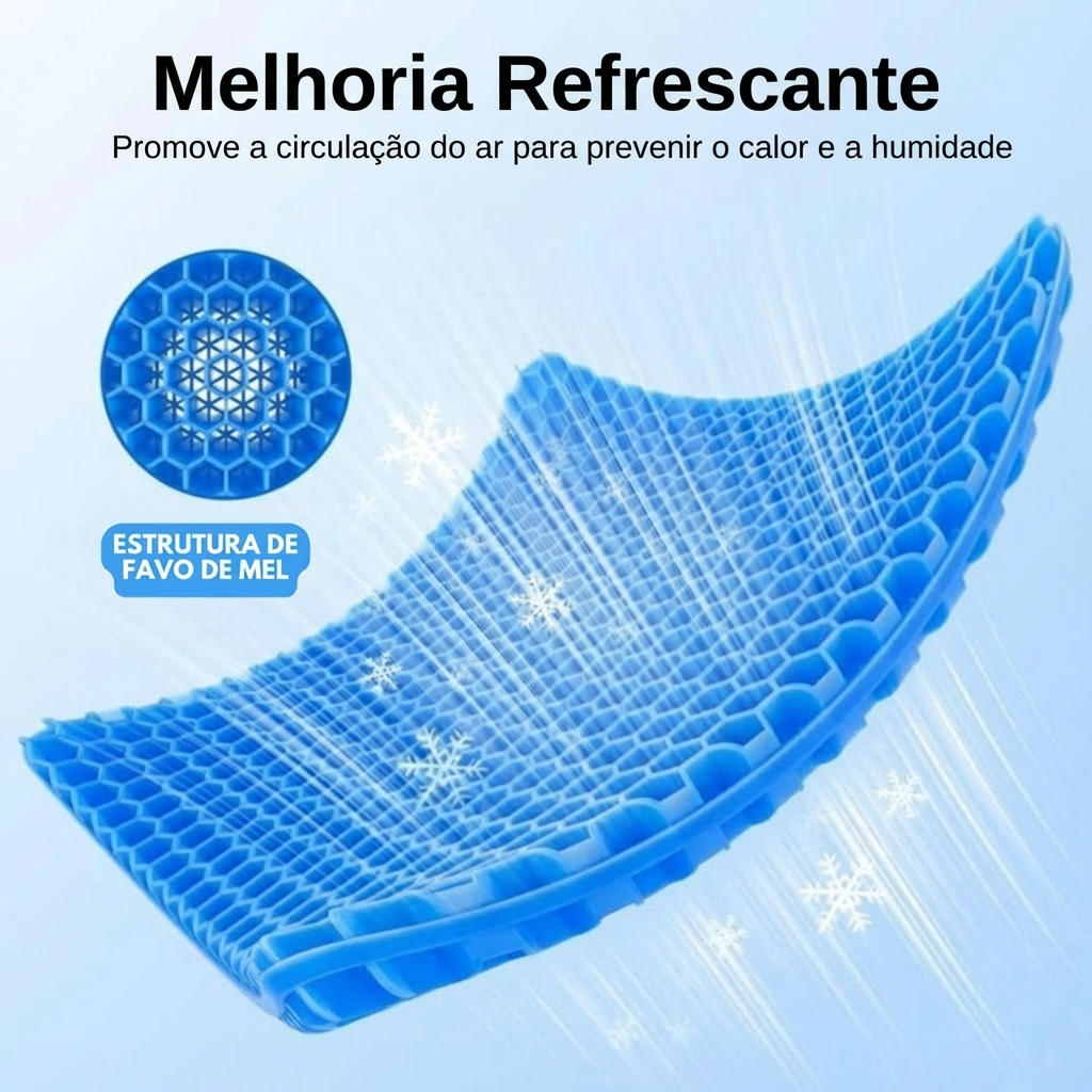 O CoolGel+ utiliza uma tecnologia de gel reativo para aliviar a pressão do cóccix. Em vez de pressionar diretamente o osso, o peso é distribuído pela superfície do gel refrescante, reduzindo aquela dor ardente que torna sentar-se insuportável.